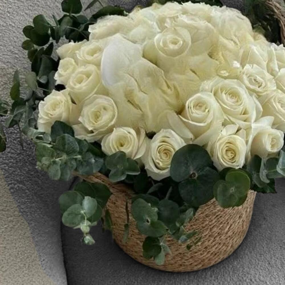 - *Roses blanches* – Symboles classiques de pureté, d'innocence et d'élégance. - *Feuilles d'eucalyptus* – Apportez de la texture et un parfum rafraîchissant, symbolisant protection et guérison. *Description* : Cette composition florale douce et élégante est composée de roses et d'hortensias blancs, entourés d'un feuillage luxuriant d'eucalyptus. Présentée dans un panier tressé rustique, elle dégage un charme épuré, moderne et naturel. Idéale pour les mariages, les condoléances ou une décoration intérieure raffinée.