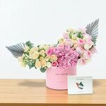 pink hydrangea - 1 pce tiges d'eucalyptus - 3 pce pink roses - 13 pce roses spray blanches - 7 pce feuilles sèches peintes à la main - 2 pce roses spray pêche somptueuses - 7 pce boîte de chocolats artisanaux - 1 pce