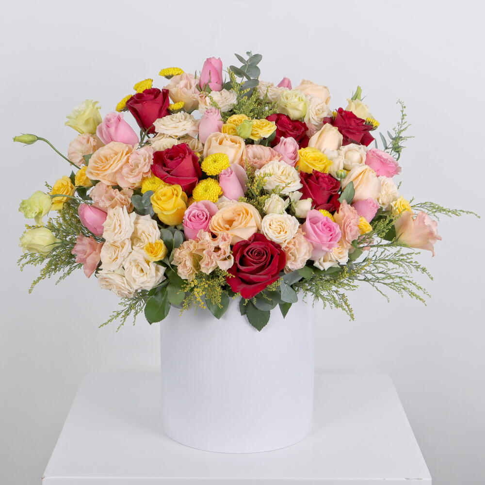 Une immense boîte de joie remplie de roses et de bébés roses en rouge, rose, pêche et jaune avec la fleur de chrysanthème distinctive et la fleur d'astoma avec l'eucalyptus parfumé et le solidago pour que vous ayez une immense boîte pleine de belles couleurs dans un merveilleux arrangement comme cadeau pour une personne chère à votre cœur.