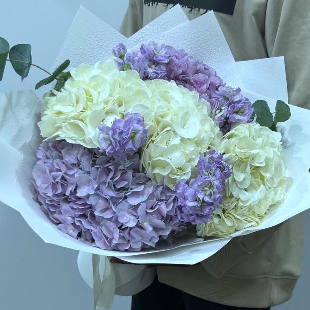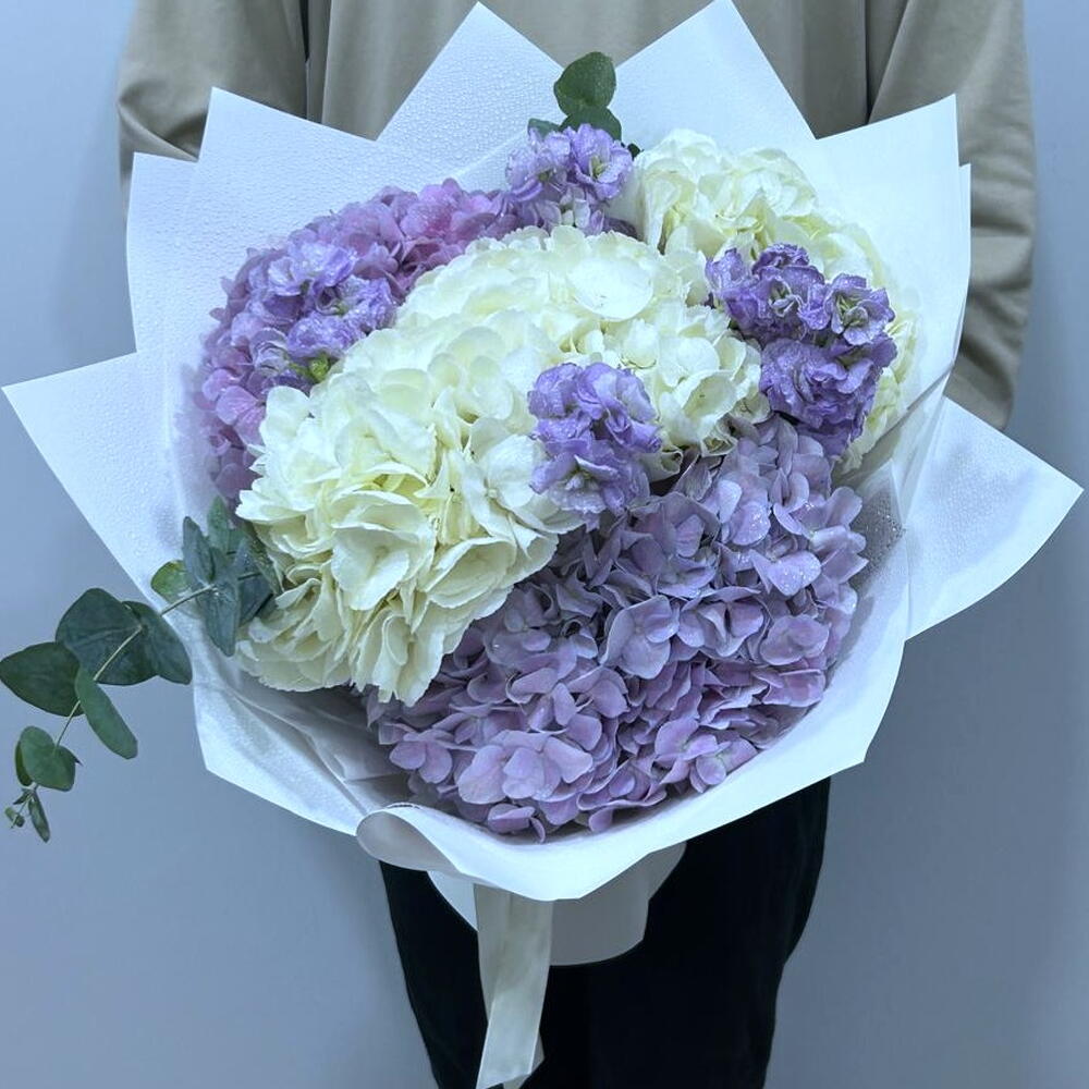 hortensia blanc - 2 pce wrapping paper - 5 pce hortensia violet - 2 pce eucalyptus leaves - 2 pce mathiola pourpre - 4 pce