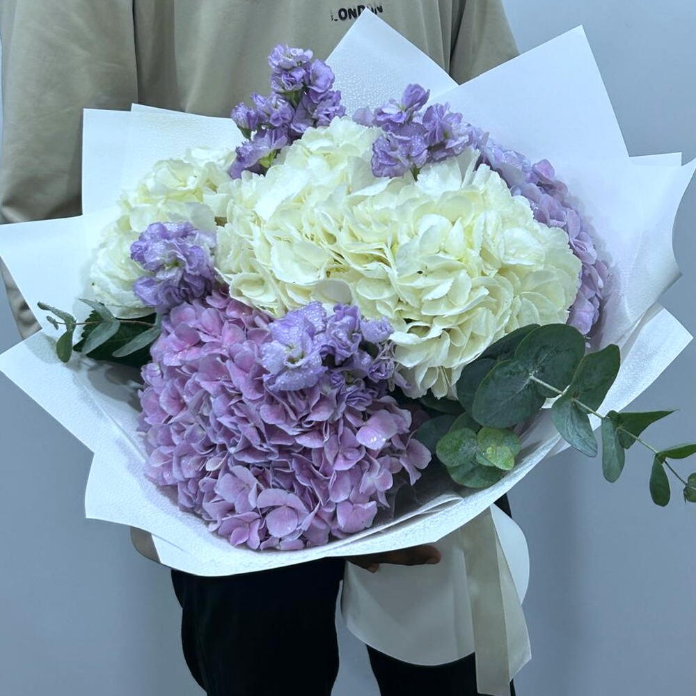 Plongez dans le charme envoûtant de ce sublime bouquet mono. Soigneusement cueilli à la main, ce bouquet se compose de deux hortensias violets et de deux hortensias blancs, incarnant à la fois grâce et beauté. Quatre majestueuses Matthiola violettes, joliment entrelacées avec deux feuilles d'eucalyptus aromatiques, viennent compléter ce bouquet. Un coffret de cinq papiers d'emballage raffinés encapsule toute cette beauté. Plus qu'une simple collection de fleurs, ce bouquet mono est une œuvre d'art qui apporte sérénité et bien-être.