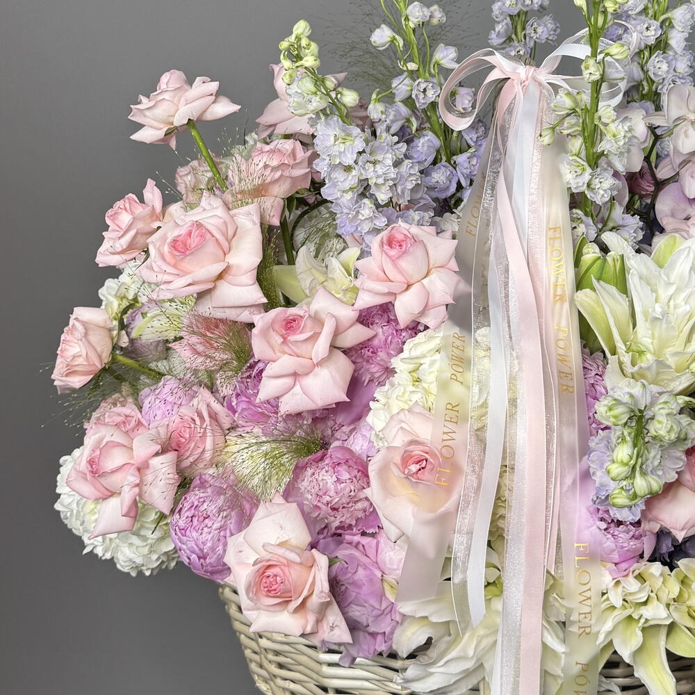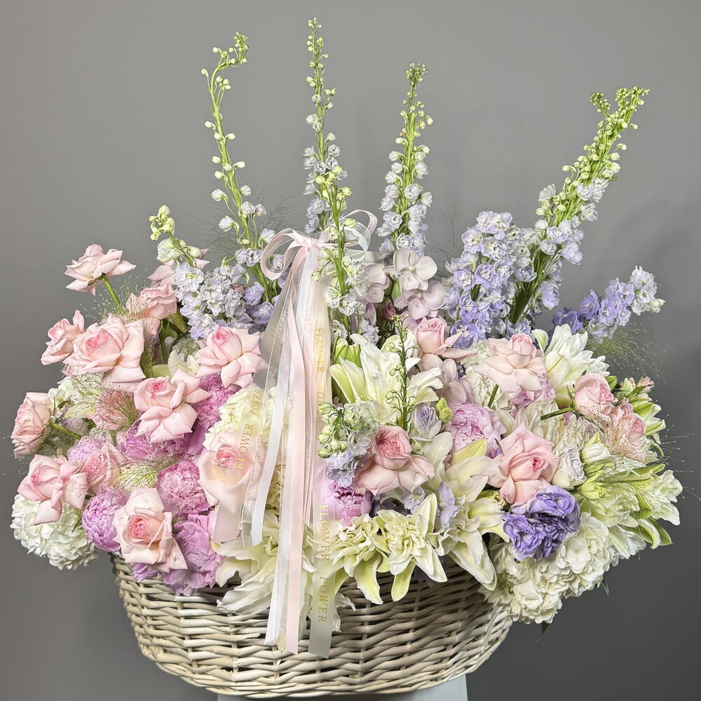 Un somptueux arrangement en panier inspiré par l'élégance royale. Présentant un gracieux mélange de roses pastel, de lys, de pivoines, de delphiniums et d'hortensias, cette composition donne vie à la sérénité d'un jardin anglais. Idéal pour les grandes célébrations, les baby showers ou la décoration intérieure luxueuse.