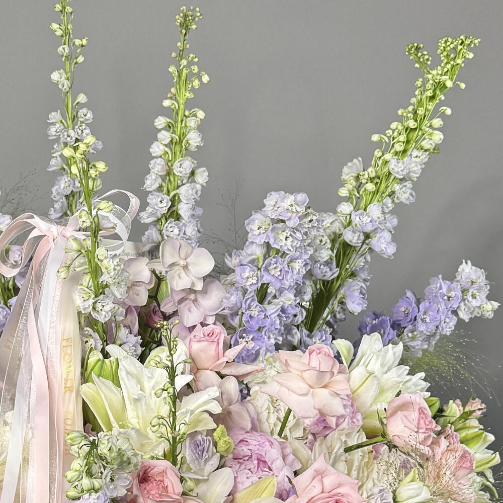 Eustoma - 20 pce Spray rose - 30 pce Hydrangea - 20 pce Lilium - 20 pce Peony - 20 pce rose de jardin - 50 pce delphinium - 15 pce panicum - 15 pce