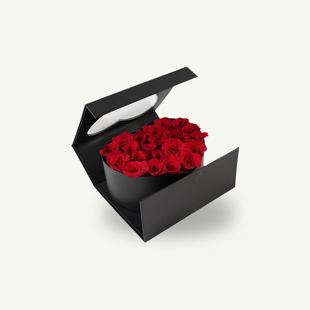 Une composition luxueuse de 25 à 30 roses rouges fraîches, délicatement arrangées dans une élégante boîte noire en forme de cœur, la déclaration romantique parfaite.