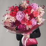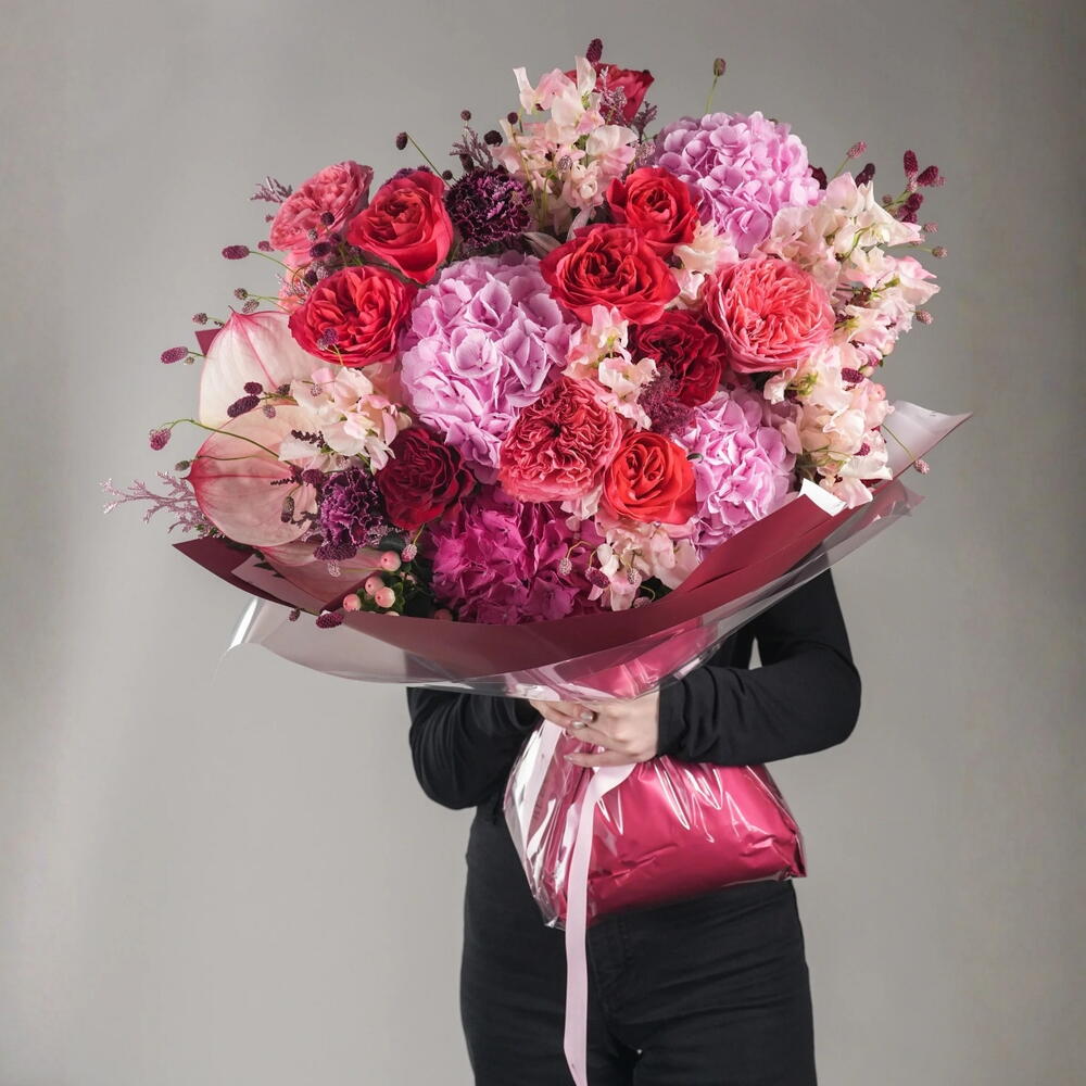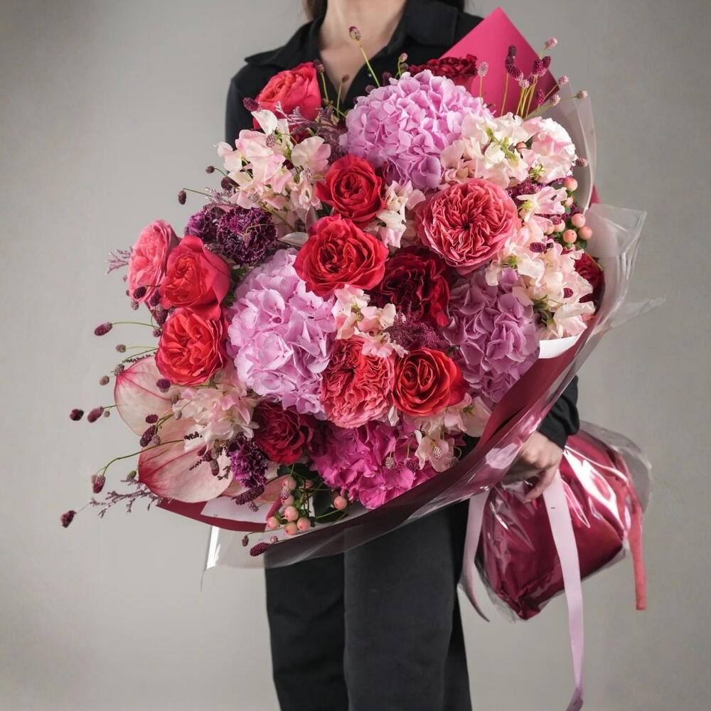 Anthurium - 2 pce carnation - 10 pce rose de jardin - 10 pce white hydrangea - 1 pce pink hydrangea - 4 pce sanguisorbe - 10 pce feuilles de fougère - 10 pce douceurs apaisantes - 20 pce