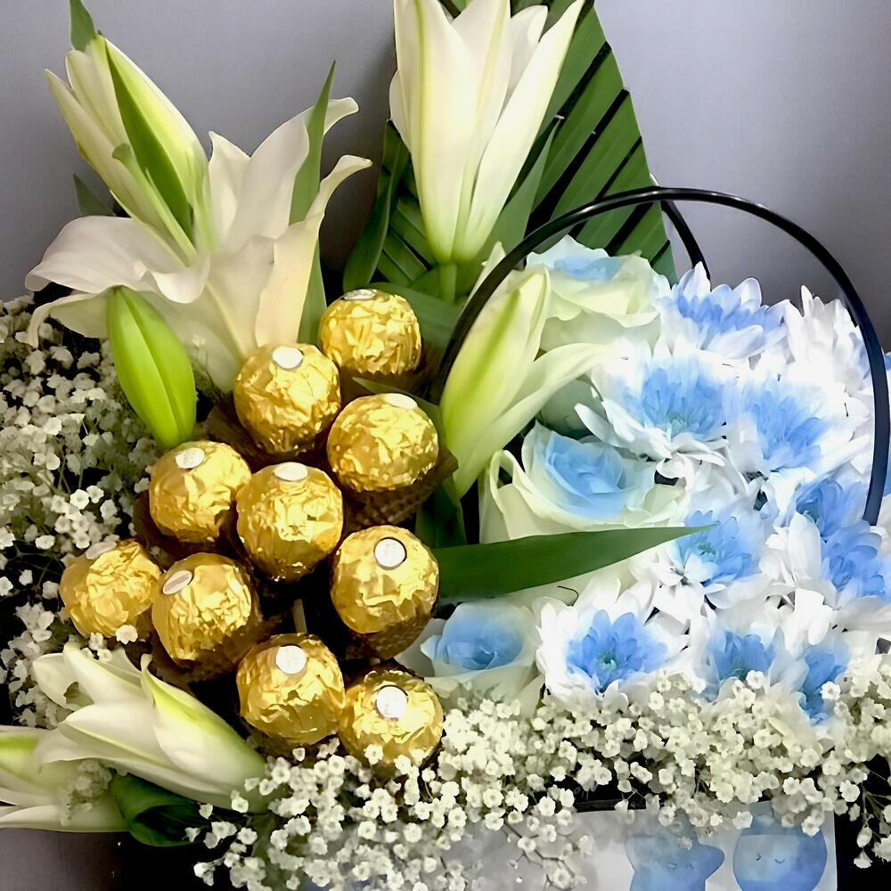 rose - 3 pce chrysanthemums - 5 pce lys blanc - 3 pce gypso - 3 pce mousse oasis - 1 pce sac imprimé « c'est un garçon » - 1 pce