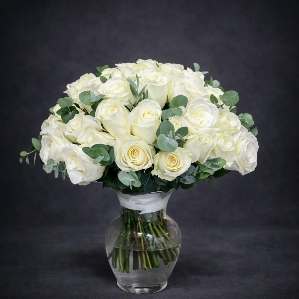 Cet arrangement floral raffiné comprend 51 roses blanches de qualité supérieure, associées délicatement à du feuillage d'eucalyptus frais et présentées dans un vase en verre transparent.
