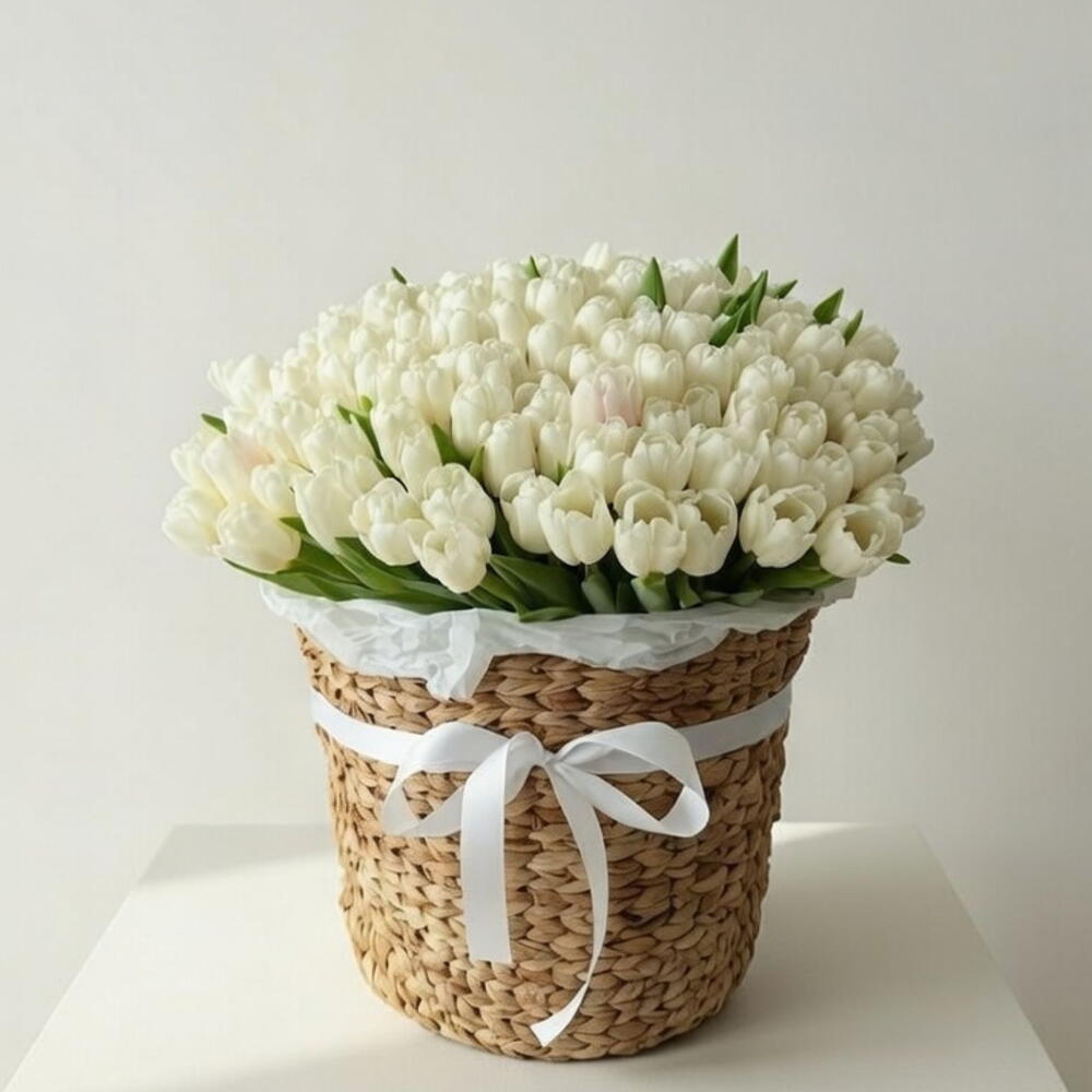 Un luxueux arrangement floral composé de 60 tulipes fraîches d'un blanc ivoire, soigneusement disposées dans un panier tressé artisanal en fibres naturelles et orné d'un élégant ruban blanc. Cette composition allie douceur et raffinement, créant un dôme floral aérien et généreux. La texture naturelle du panier, associée à la pureté des fleurs, offre une présentation intemporelle et prestigieuse. Idéal pour : Cadeaux d'anniversaire élégants Félicitations d'entreprise Cadeaux pour le Ramadan et l'Aïd Décoration intérieure minimaliste Gestes romantiques raffinés