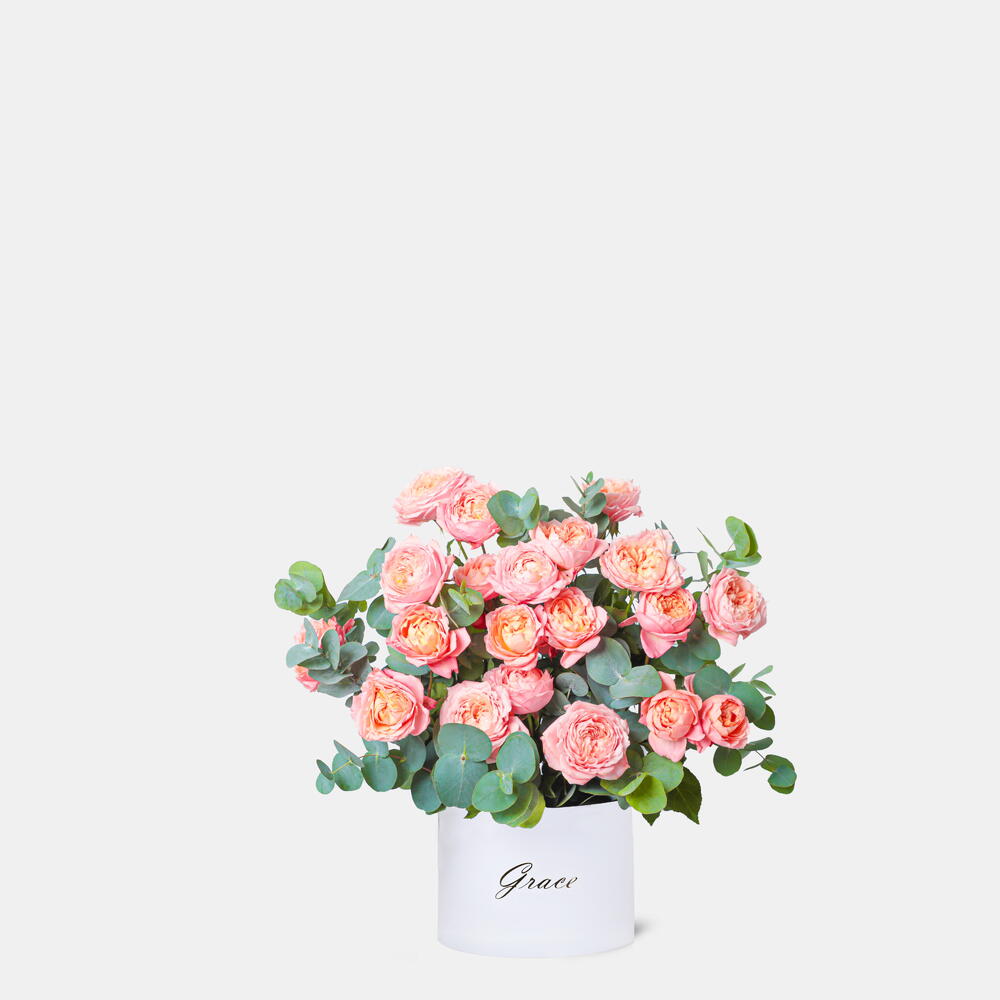 La Juliet Peach en boîte présente d'élégantes roses couleur pêche, magnifiquement associées à l'eucalyptus, créant une composition florale éblouissante et parfumée.