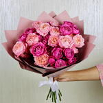 Un ravissant bouquet mixte composé de 5 tiges de roses spray Julietta couleur pêche et de 5 tiges de roses spray Julietta rose foncé. Les douces nuances pêche dégagent chaleur et élégance, tandis que les fleurs d'un rose foncé vibrant apportent une touche audacieuse et romantique. Ensemble, elles créent un mélange harmonieux de charme et de sophistication, parfait pour toutes les occasions. Cette composition luxuriante est un geste sincère, qui rayonne de beauté et de grâce et saura illuminer la journée de quiconque.