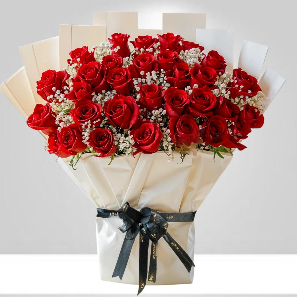 Les fleurs sont arrangées en un grand bouquet rond et enveloppées dans un papier de couleur claire, peut-être blanc ou crème. Le bouquet est attaché avec un large ruban noir. Les roses rouges sont un symbole classique d'amour et de passion, ce qui fait de ce type de bouquet un choix populaire pour les occasions romantiques telles que les anniversaires et la Saint-Valentin.