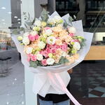 Vous cherchez le cadeau floral parfait ? Ce bouquet luxuriant, noué à la main, est composé de roses spray de qualité, de lisianthus délicats et d'eucalyptus frais. Conçu dans une palette pastel romantique de rose poudré, pêche et crème, c'est la surprise ultime à offrir sans raison particulière ou pour la Saint-Valentin. Enveloppé dans notre papier imperméable signature avec un ruban de luxe. Livraison de fleurs le jour même disponible pour garantir que votre cadeau arrive frais et éclatant ! 🌸