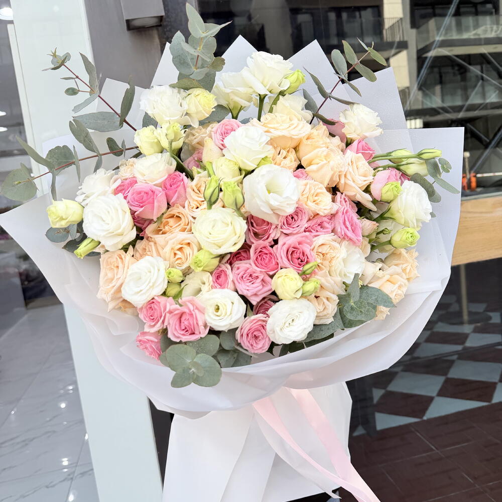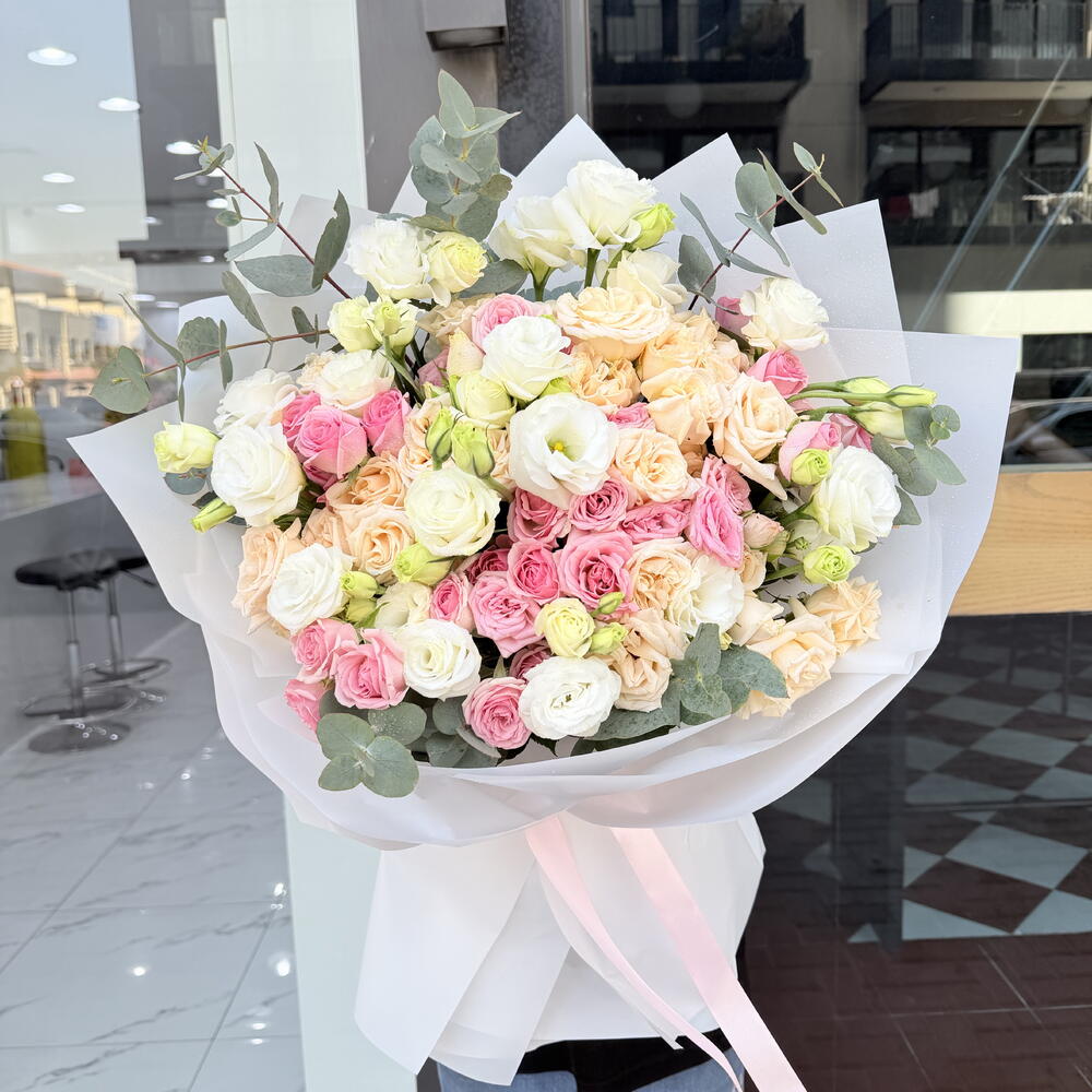 Vous cherchez le cadeau floral parfait ? Ce bouquet luxuriant, noué à la main, est composé de roses spray de qualité, de lisianthus délicats et d'eucalyptus frais. Conçu dans une palette pastel romantique de rose poudré, pêche et crème, c'est la surprise ultime à offrir sans raison particulière ou pour la Saint-Valentin. Enveloppé dans notre papier imperméable signature avec un ruban de luxe. Livraison de fleurs le jour même disponible pour garantir que votre cadeau arrive frais et éclatant ! 🌸