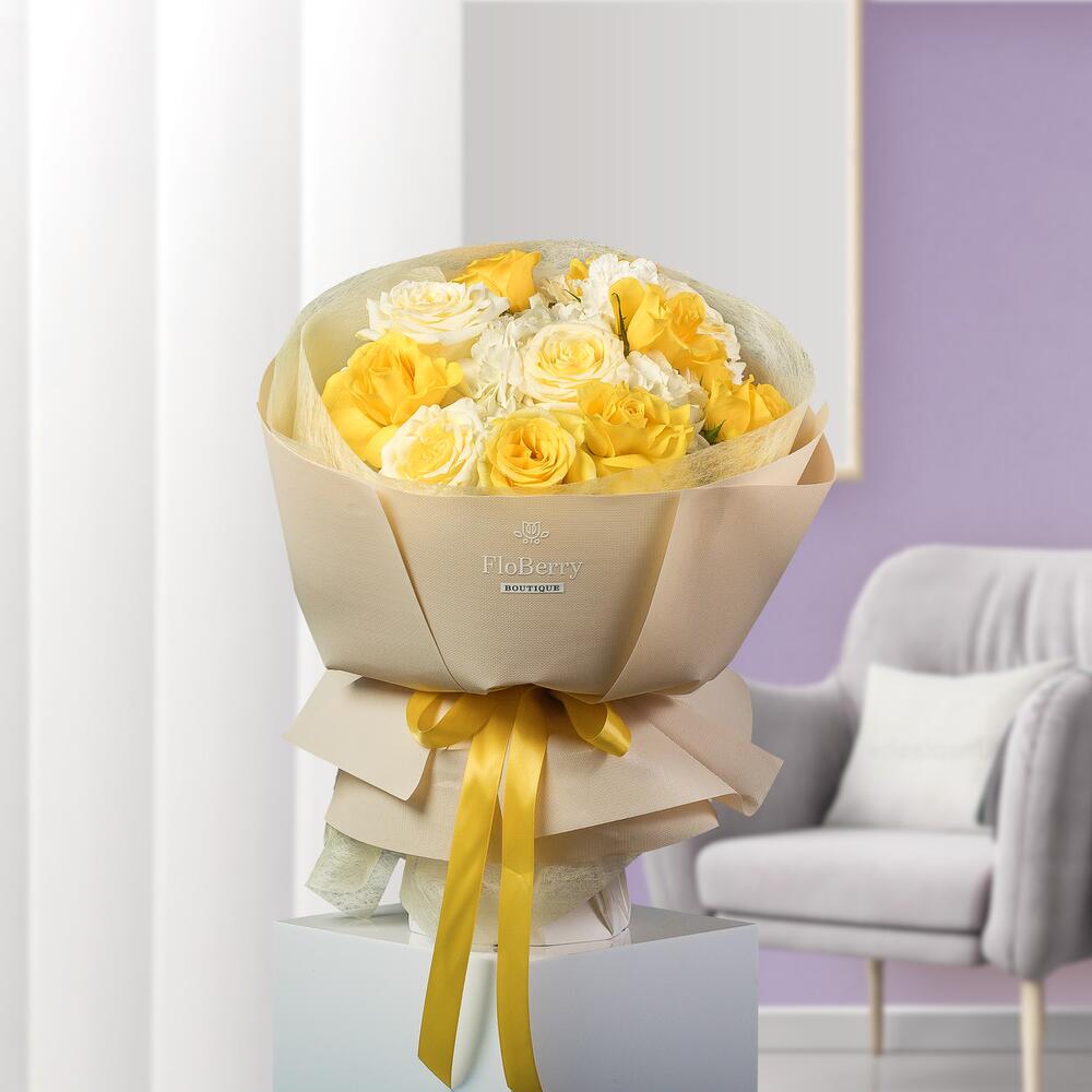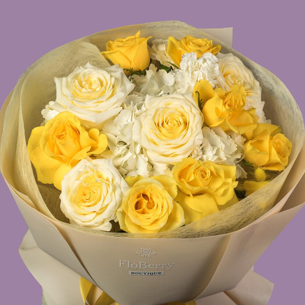 Hydrangea - 2 pce Wrapping - 1 pce matthiola - 1 pce feuille de pistacia - 1 pce botte de lagurus séchés violets clairs - 5 pce bougie rose - 4 pce rose yelloween 50 clé - 7 pce