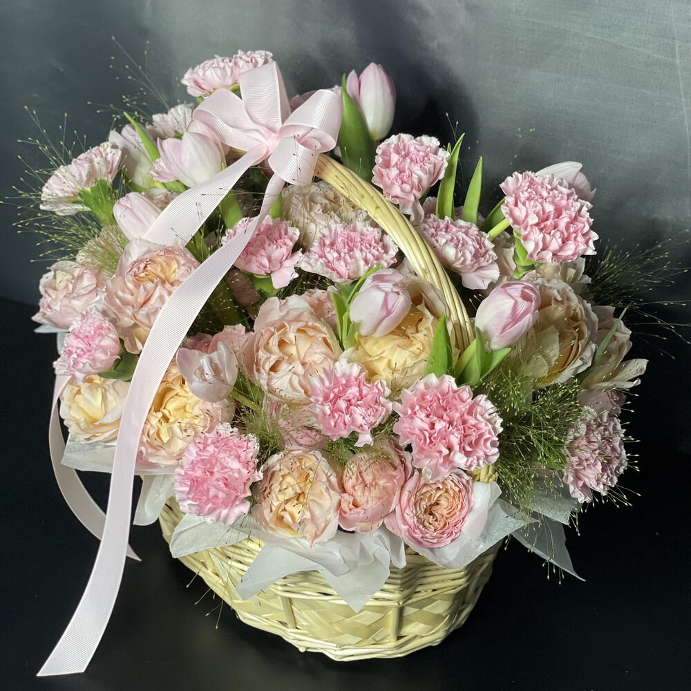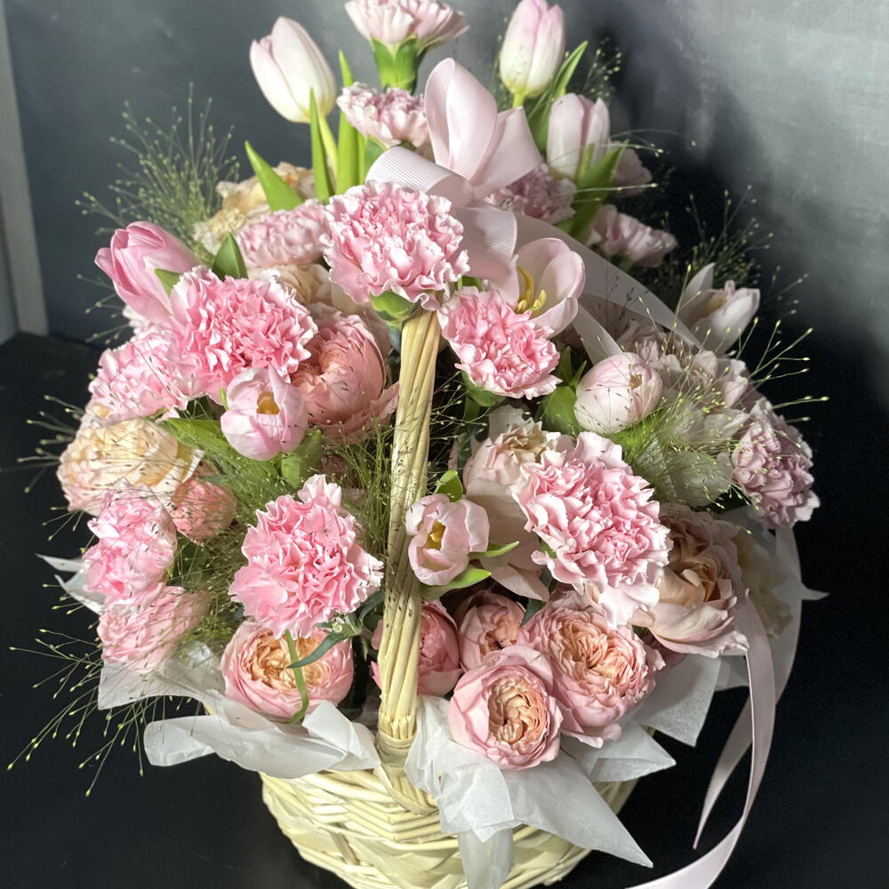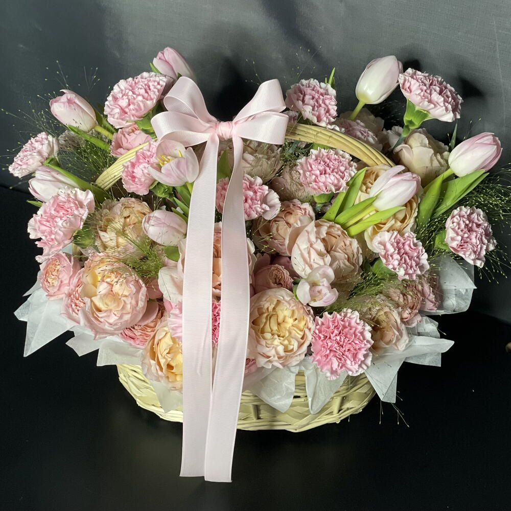 A soft blend of pink and peach tones, this wooden basket features 10 pink tulips, 5 peach spray roses (Juliata), 5 pink Bombastic spray roses, 15 pink carnations, and 10 stems of airy panicum creating a delicate, romantic arrangement with a natural garden feel.