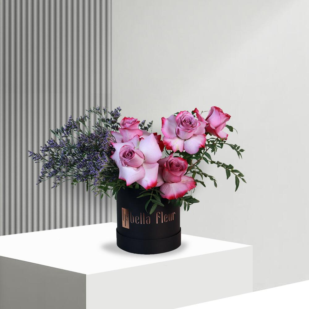 Eucalyptus - 1 pce Limonium - 4 pce rose - 5 pce petite boîte noire bella - 1 pce