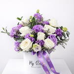 white roses 7 eustoma purple 10 limonium purple 4 eucalyptus 1