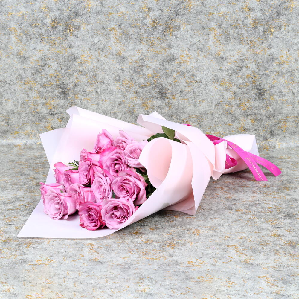 15 roses violettes Magnifiquement enveloppées dans un emballage couleur pastel Nouées d'un ruban rose