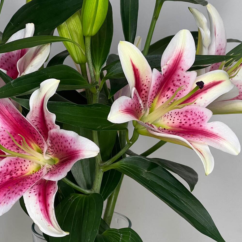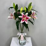 Trois lis roses dans un grand vase en verre.