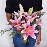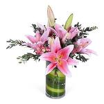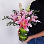Un superbe arrangement de *lys roses* élégants, magnifiquement présenté dans un vase en verre transparent. Ces fleurs douces et gracieuses symbolisent l'admiration, l'amour et les vœux chaleureux — ce qui en fait le cadeau parfait pour toute occasion sincère. Leur doux parfum et leurs pétales aux couleurs vives ajoutent charme et sophistication à tout espace, que ce soit un foyer, un bureau ou une célébration. Idéal pour les anniversaires, les noces ou simplement pour égayer la journée de quelqu'un.