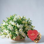 Un arrangement en panier de 40 lys blancs avec feuillages verts et 12 chocolats assortis Premium Godiva magnifiquement confectionnés dans une élégante boîte en forme de cœur