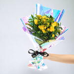 Frais, joyeux et plein de charme — ce bouquet radieux de roses jaunes est la façon parfaite d'égayer la journée de quelqu'un. Enveloppé dans un film holographique accrocheur et noué d'un ruban noir chic, c'est une approche audacieuse et moderne du cadeau floral. Les fleurs d'un jaune vibrant symbolisent l'amitié, l'optimisme et les nouveaux départs, ce qui en fait un choix idéal pour les anniversaires, les félicitations ou simplement pour répandre le bonheur. Un feuillage luxuriant et des fleurs d'appoint dorées apportent de la texture et de l'équilibre à cette palette joyeuse. Pour préserver le bouquet au mieux, coupez les tiges en biais, changez l'eau tous les deux jours et placez-le dans un endroit frais et ombragé.