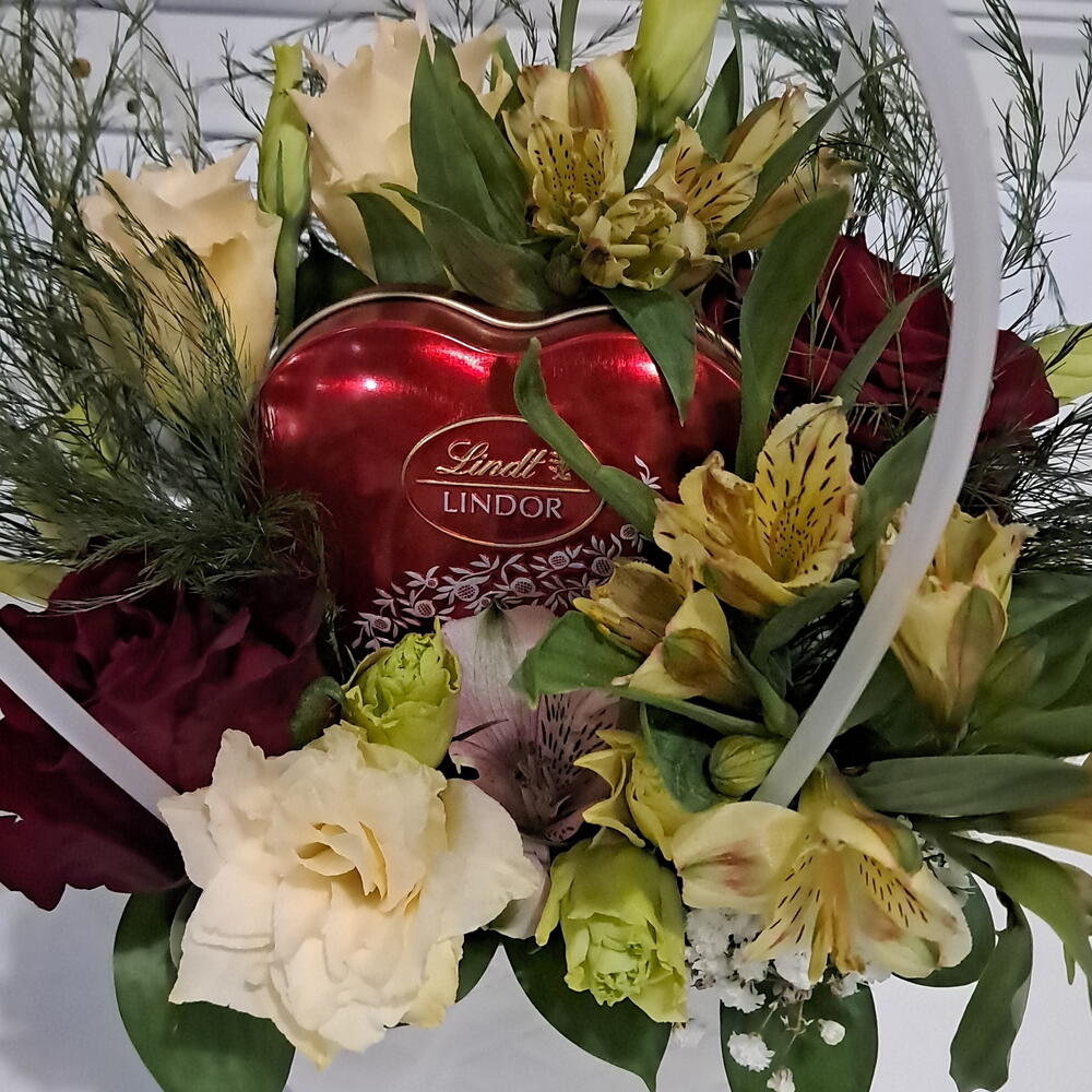 Red rose - 2 pce Alstroemeria - 2 pce carnation white - 1 pce gypsophile blanche - 1 pce lindt chocolate - 1 pce fougère d'asperge - 2 pce lisianthus orange - 2 pce