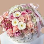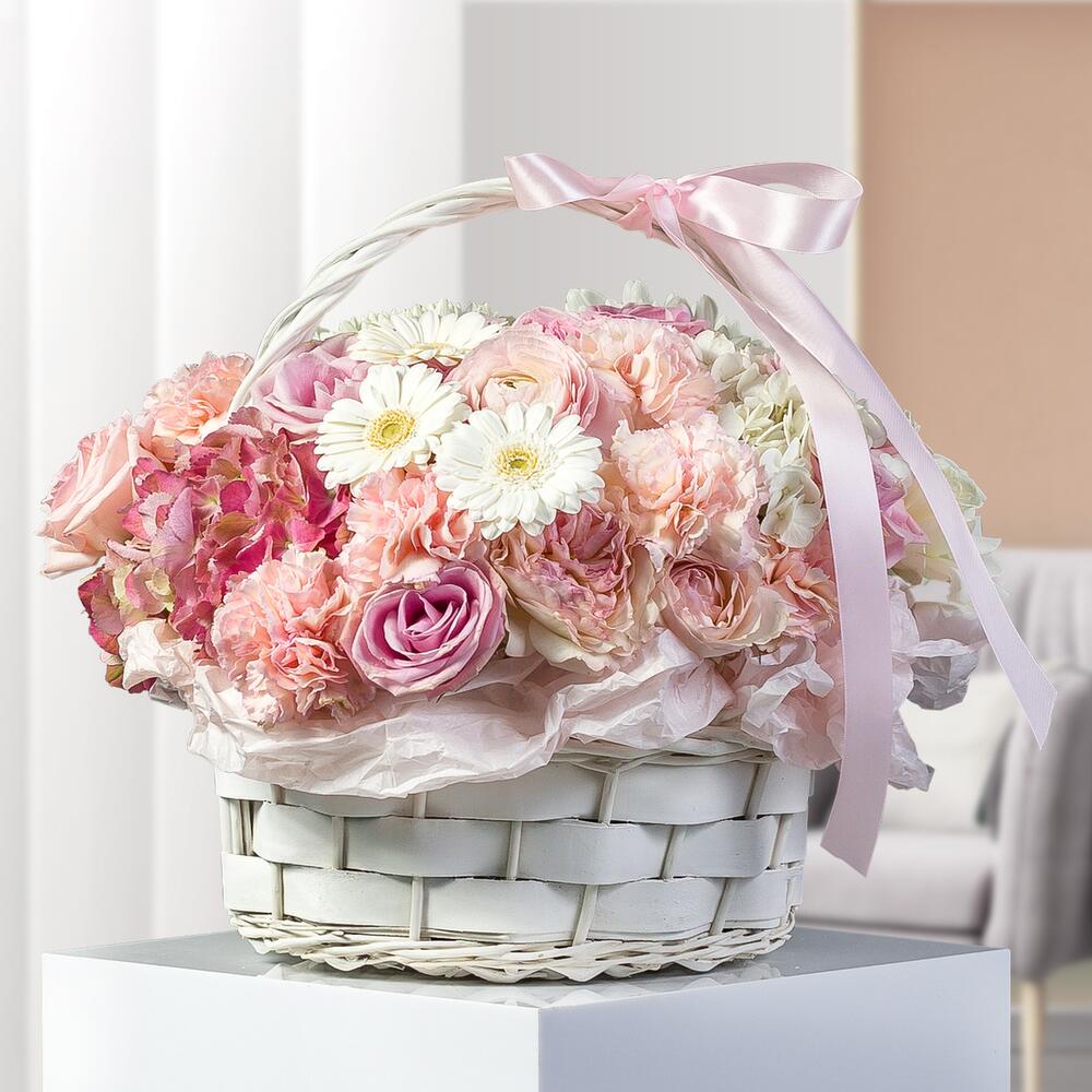 Hydrangea - 3 pce carnation - 5 pce ranunculus - 1 pce gerbera mini - 3 pce panier en osier - 1 pce oasis (mousse) - 1 pce rose lena 50 clé - 9 pce ohara rose rose (Équateur) - 3 pce