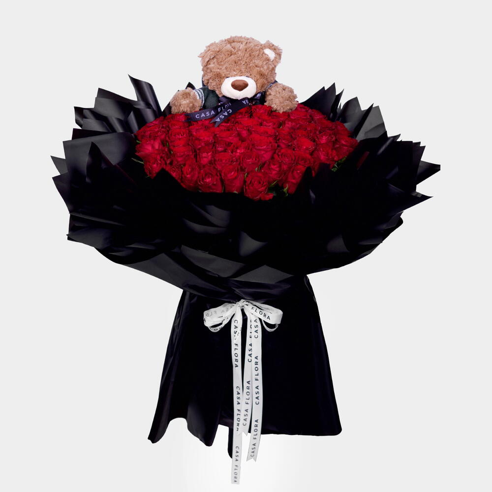 Un somptueux bouquet de 101 roses rouges accompagné d'un ours en peluche, élégamment enveloppé dans un papier noir sophistiqué un symbole exquis et intemporel d'amour et de passion.