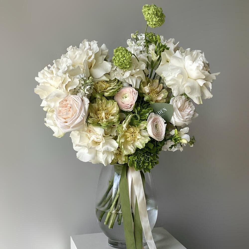 Bouquet luxueux de fleurs blanches et vertes, rehaussé d'élégants détails perlés : un choix élégant pour les grandes occasions ou un cadeau raffiné. Comprend : hortensia, eustoma, freesia, viorne, rose Moonstone, matthiola, rose O’hara et rose Veggie. L’ensemble comprend un vase en verre, un sac à fleurs, une carte, des conseils d’entretien et un engrais pour fleurs. *Livraison de fleurs aujourd’hui Parfait pour : - un cadeau pour elle ; - un mariage ou un anniversaire ; - un anniversaire ; - un cadeau complémentaire ; - un cadeau pour toutes occasions.