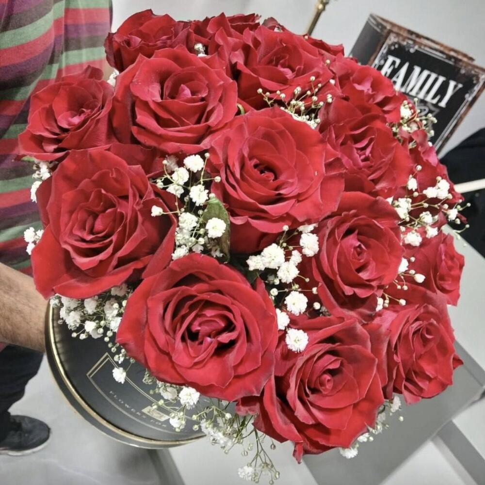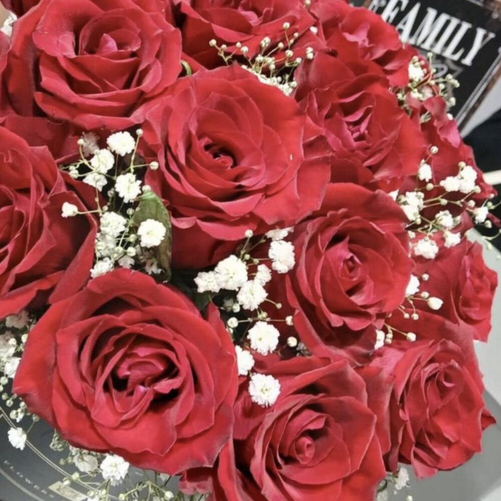 Box - 1 pce Gypsophila - 4 pce red roses - 23 pce