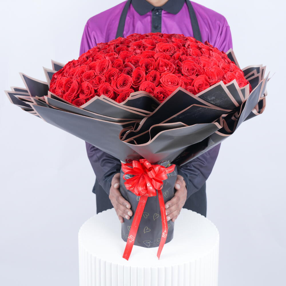 201 roses rouges Papier cadeau noir avec bordure dorée Papier à motif en forme de cœur noir Ruban rouge