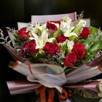 Lilium - 3 pce alstroemeria white - 2 pce limonium blanc - 7 pce lourd - 7 pce alstroemère violet foncé - 2 pce metchola whi6 - 2 pce