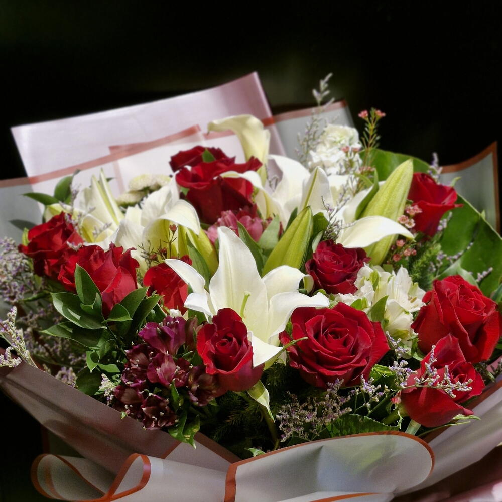 Lilium - 3 pce alstroemeria white - 2 pce limonium blanc - 7 pce lourd - 7 pce alstroemère violet foncé - 2 pce metchola whi6 - 2 pce