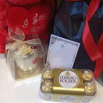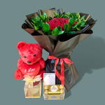 card - 1 pce roses - 30 pce ruscuss - 20 pce ours en peluche 40x35 cm - 1 pce bougie parfumée - 1 pce boîte de chocolats Ferrero Rocher - 1 pce