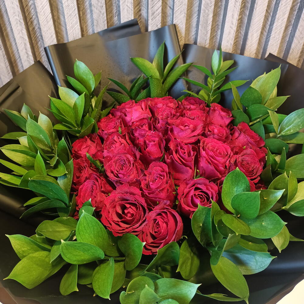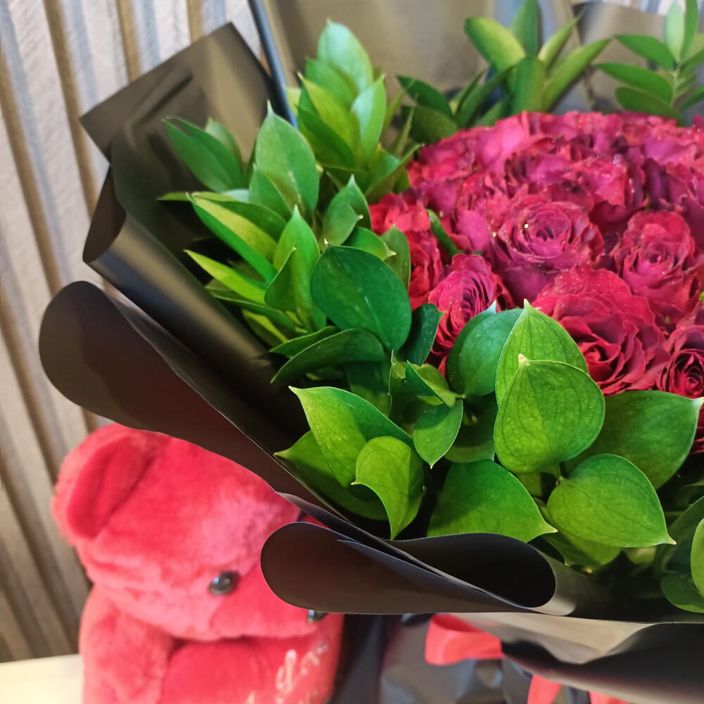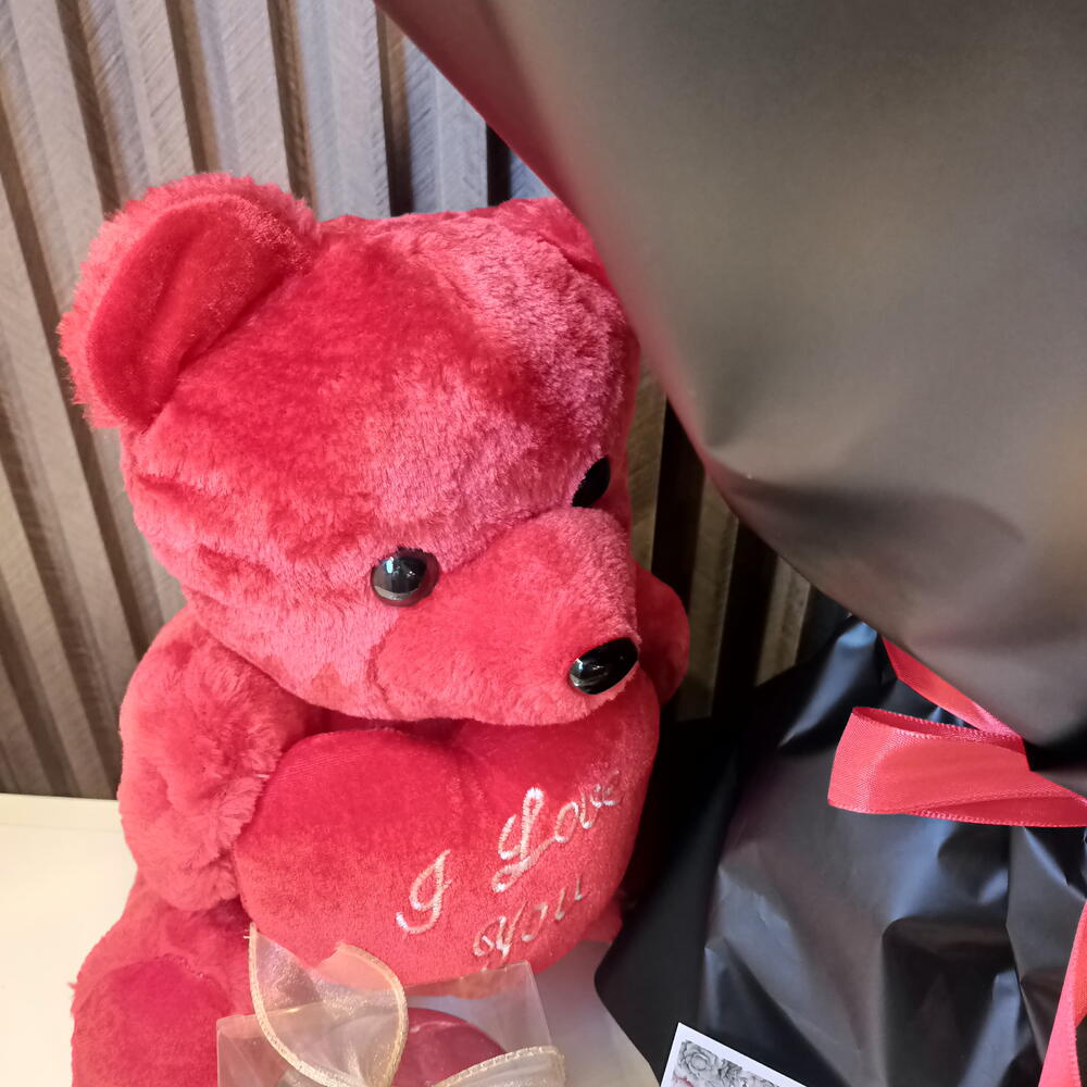 card - 1 pce roses - 30 pce ruscuss - 20 pce ours en peluche 40x35 cm - 1 pce bougie parfumée - 1 pce boîte de chocolats Ferrero Rocher - 1 pce