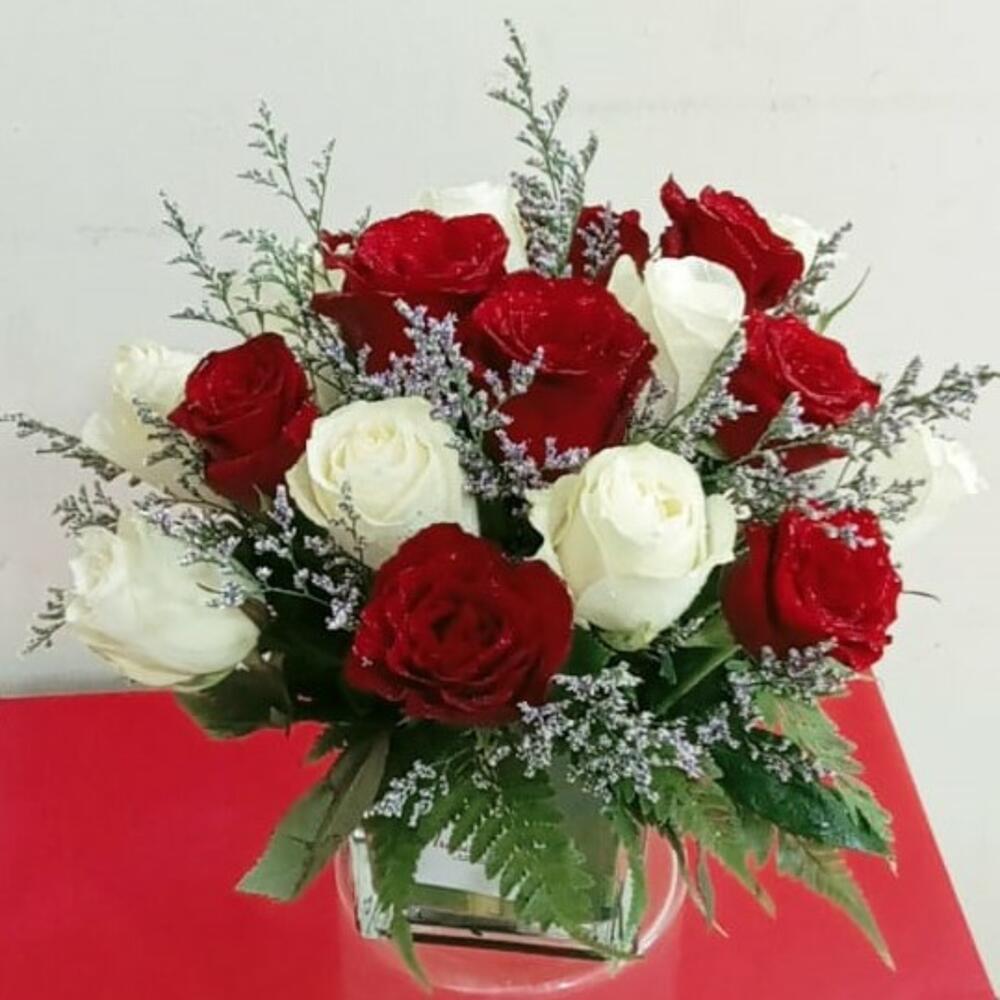 Red rose - 9 pce White rose - 9 pce vase 12x12 - 1 pce