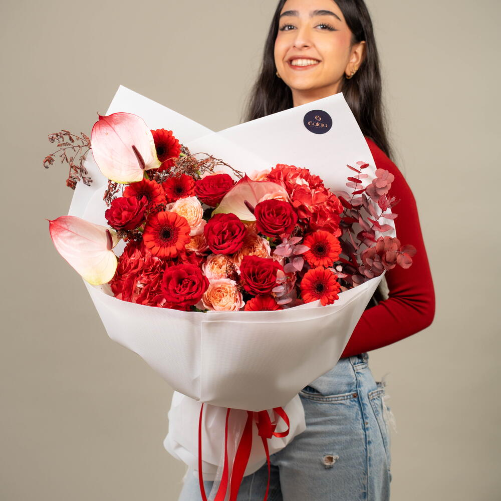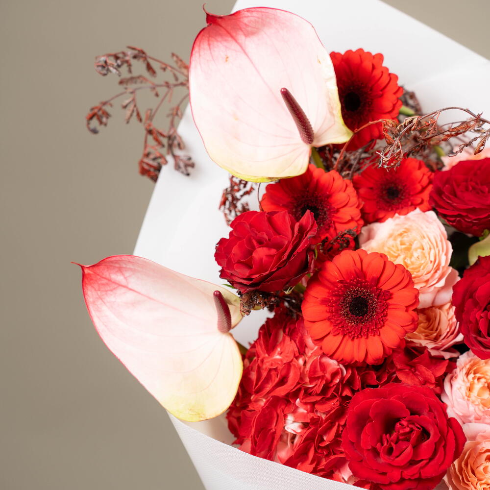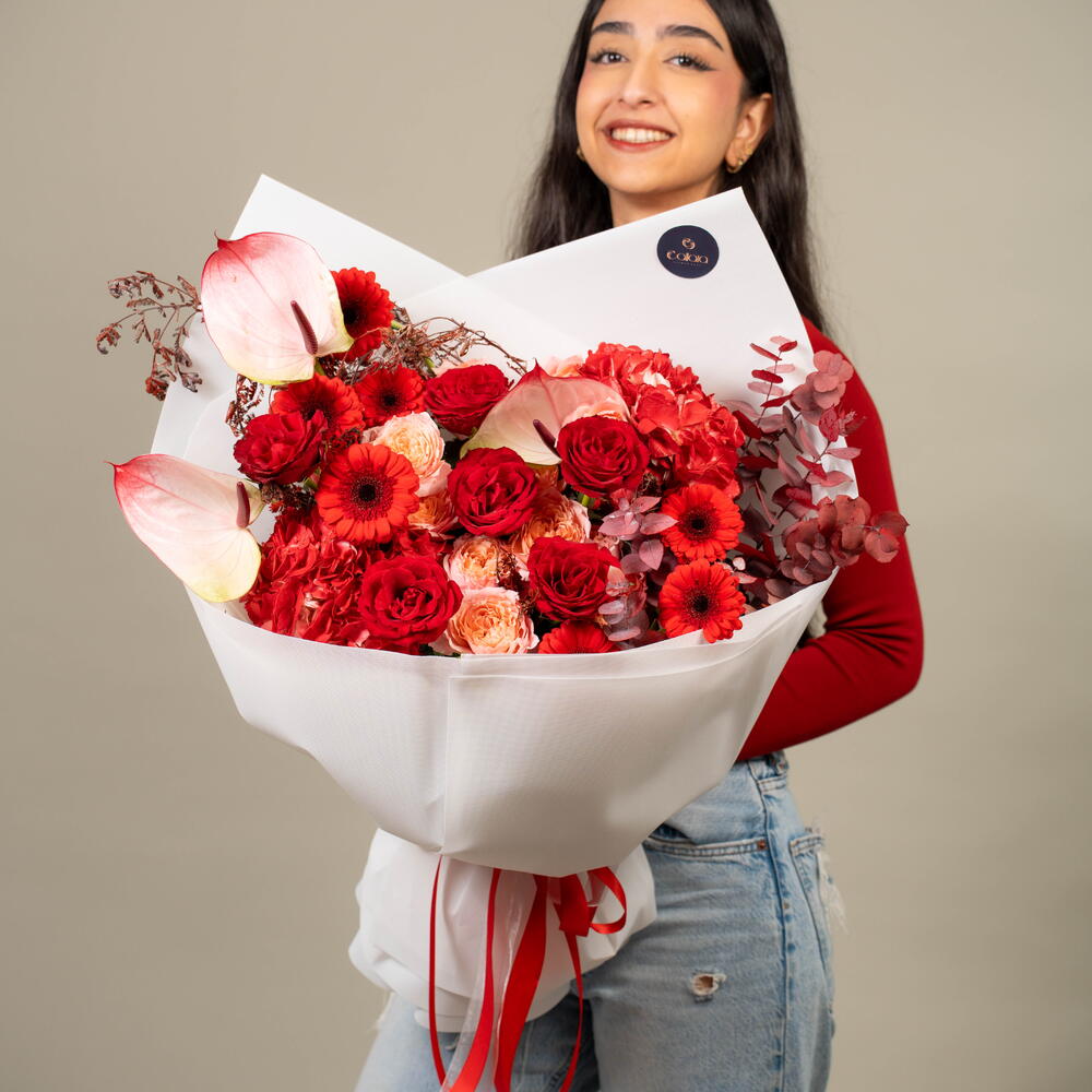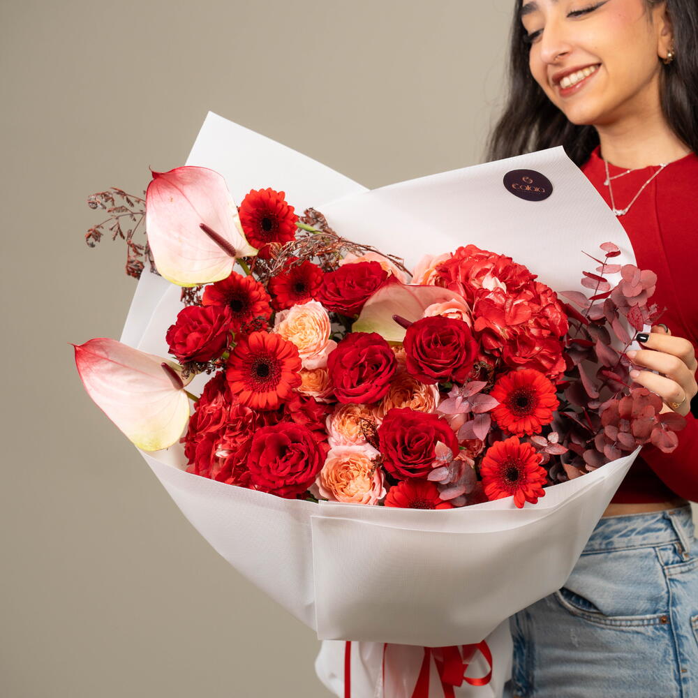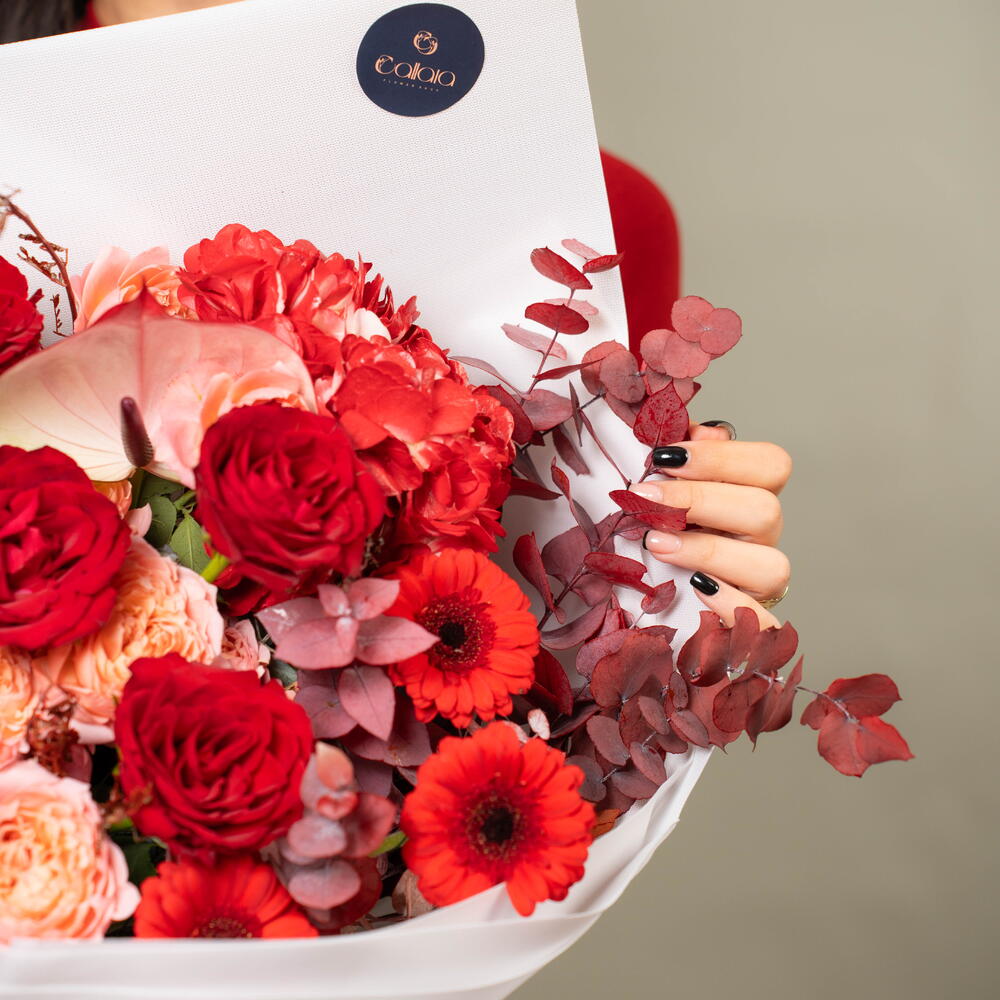 Découvrez la splendeur des roses rouges passionnées, des hortensias délicats, des gerberas éclatants, des anthuriums exotiques, de l'acacia subtil et des roses pêche Julietta luxuriantes, le tout habilement assemblé en bouquet. L'arrangement est parfaitement complété par le parfum boisé de l'eucalyptus d'automne, en faisant un cadeau parfait pour toute occasion. Composé de sept roses et gerberas, de deux hortensias, de trois anthuriums, d'acacia et de fleurs pêche Julietta, combinés à cinq généreuses branches d'eucalyptus d'automne, le bouquet est conçu pour déclarer l'amour, l'amitié et la reconnaissance. Sentez la magie de ce spécial du fleuriste à chaque fois que vous regardez ce magnifique mélange des plus beaux trésors de la nature.