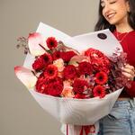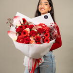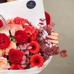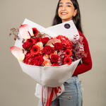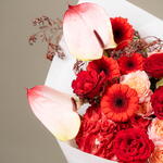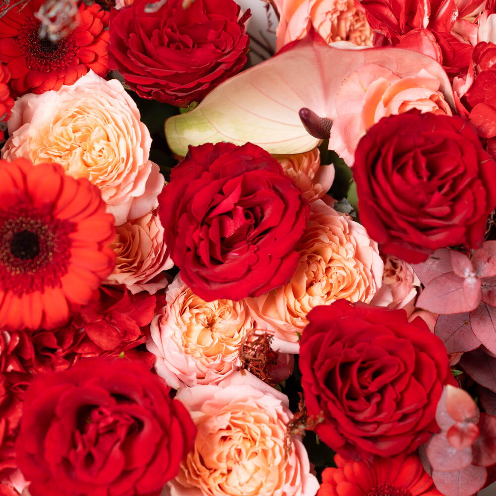 Red rose - 7 pce Hydrangea - 2 pce Gerbera - 7 pce Anthurium - 3 pce acacia - 3 pce julietta pêche - 3 g eucalyptus automnal - 5 pce