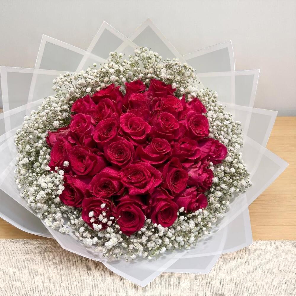 L'amour est dans l'air Rose rouge Bouquet de gypsophile – 29 roses rouges enveloppées de gypsophiles blanches