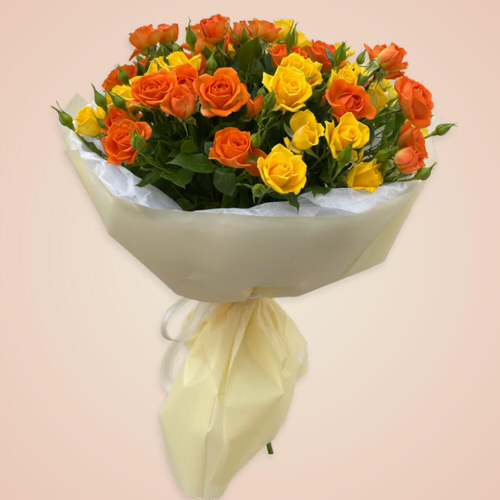 7 roses en spray orange, 5 roses en spray jaunes,
