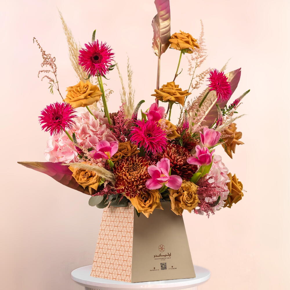 Véronique - 3 pce Hydrangea - 3 pce Gerbera - 6 pce Tulipe - 8 pce rose - 9 pce strelitzia - 3 pce astilbe - 12 pce chrysanthèmes - 6 pce pampas - 4 pce