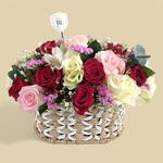 Saisissez l'essence de la romance avec notre composition Rhapsodie Romantique. Ce panier exquis de roses fraîches aux nuances de rouge profond, rose pâle et blanc crème, rehaussé de fleurs délicates, est l'expression parfaite de l'amour et de l'affection. Faite à la main avec soin et présentée dans un charmant panier tressé, c'est un cadeau idéal pour les anniversaires, les célébrations ou simplement pour faire plaisir. Laissez ces belles fleurs parler le langage de votre cœur.