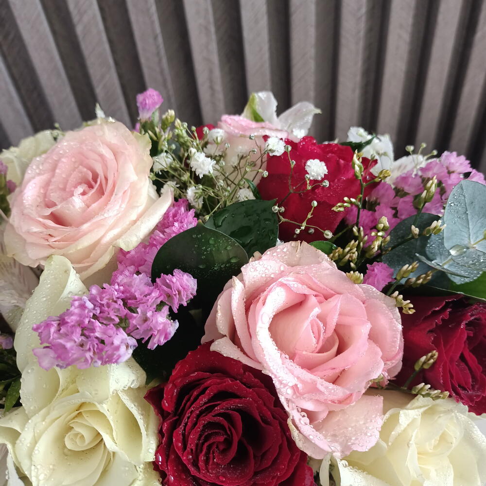 Statice - 3 pce Gypsophila - 3 pce card - 1 pce roses - 20 pce estomeria - 3 pce