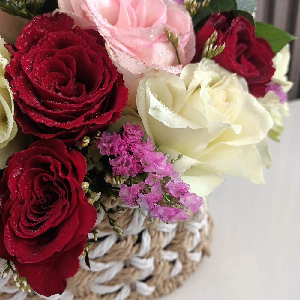 Saisissez l'essence de la romance avec notre composition Rhapsodie Romantique. Ce panier exquis de roses fraîches aux nuances de rouge profond, rose pâle et blanc crème, rehaussé de fleurs délicates, est l'expression parfaite de l'amour et de l'affection. Faite à la main avec soin et présentée dans un charmant panier tressé, c'est un cadeau idéal pour les anniversaires, les célébrations ou simplement pour faire plaisir. Laissez ces belles fleurs parler le langage de votre cœur.