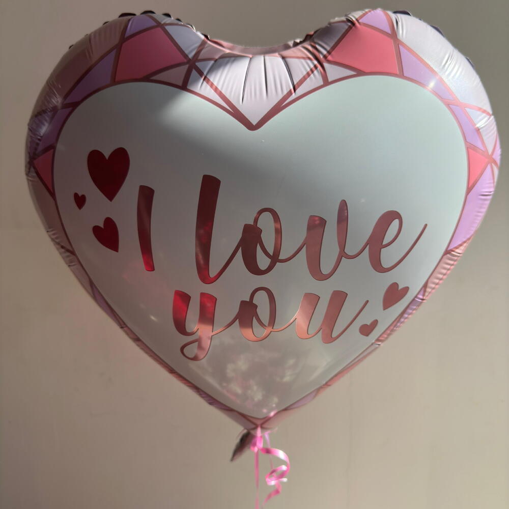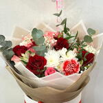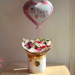Red rose - 6 pce Box - 1 pce Pink rose - 10 pce pink carnation - 3 pce white carnation - 3 pce chrysanthème blanc - 2 pce astromaria blanche - 2 pce ballon métallisé « je t'aime » - 1 pce