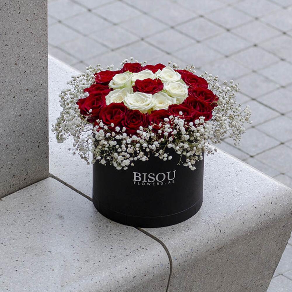 Arrangement en boîte de 15 tiges de roses blanches et rouges magnifiquement disposées dans une boîte noire avec des touches de gypsophile