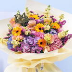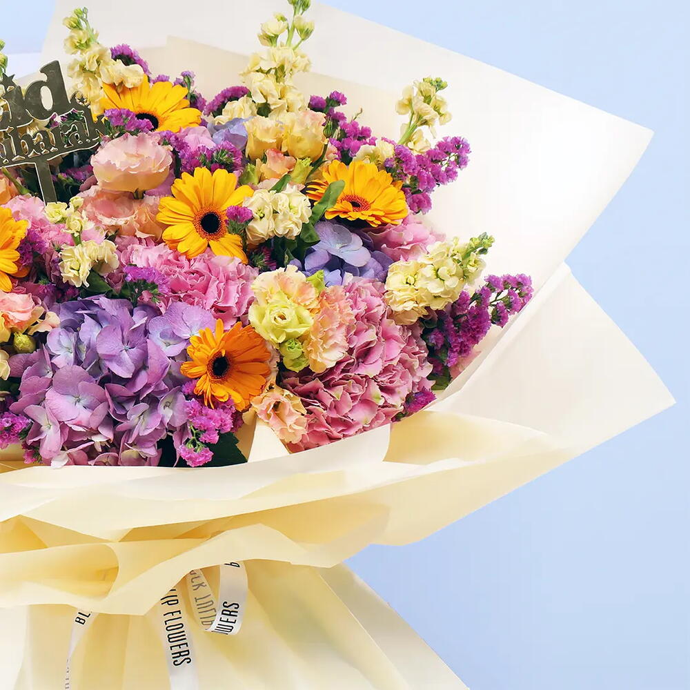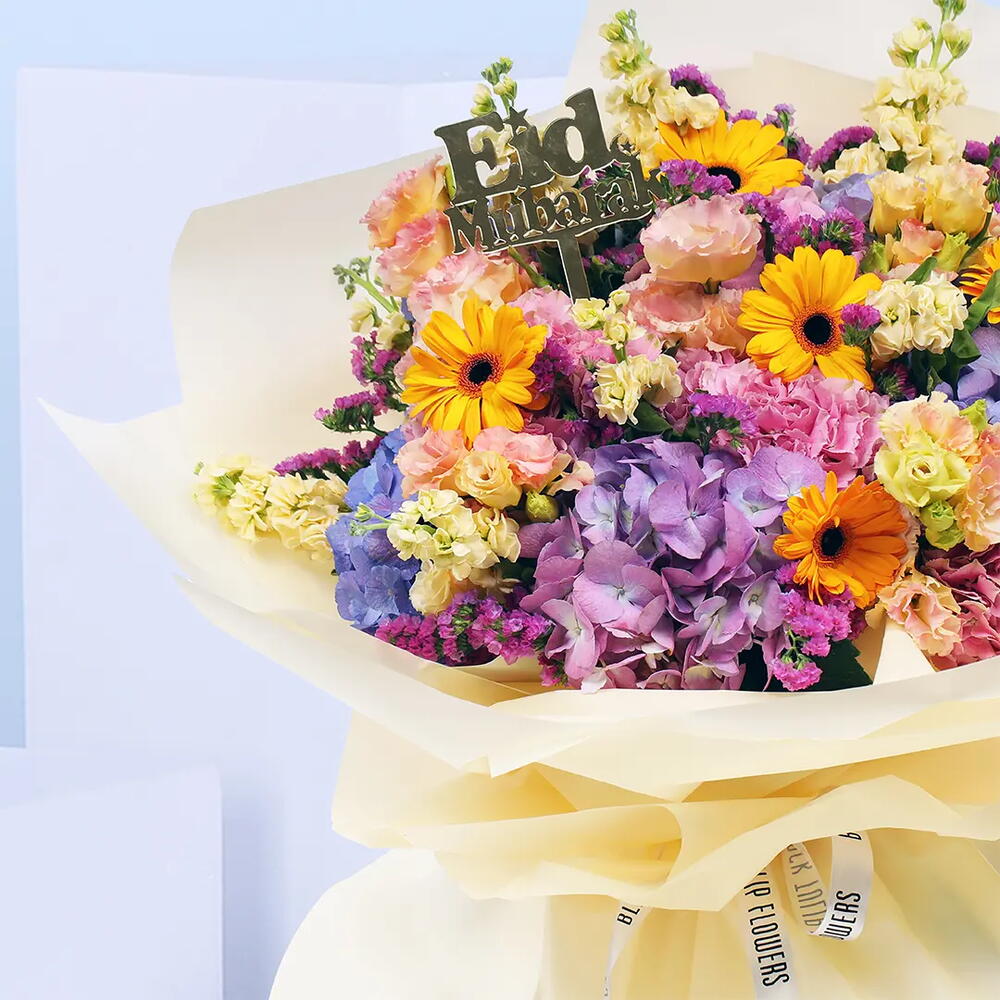 Le Ramadan est la période de l'année idéale pour se laisser aller aux couleurs. Pourquoi ne pas ajouter de la couleur à votre chambre ou bureau avec cette magnifique composition florale en croissant bleu ? C'est aussi une belle façon de transmettre vos meilleurs vœux pour ce mois de Ramadan. Ce bouquet de fleurs est composé d'hortensias, de gerberas, de matthiolas, de statices et de lisanthus. REMARQUE : Si vos fleurs arrivent en boutons fermés, ce n'est pas grave. Il suffit de les tailler et de les arroser, et elles fleuriront magnifiquement en un rien de temps ! ENTRETIEN DES FLEURS : • Les fleurs préfèrent toujours une température comprise entre 8 et 22 °C. Évitez toujours de les placer à proximité directe du soleil, d'une bouche de chauffage ou de climatisation, directement sous un ventilateur de plafond ou dans un endroit où la température ambiante est élevée. • Vous pouvez retirer l'emballage et laisser respirer les fleurs. Placez-les dans un vase propre rempli d'eau. • Changez l'eau quotidiennement. Coupez les tiges sur au moins 2 cm et retirez les feuilles sous la ligne d'eau. Bien que nous nous efforcions toujours de garantir que les produits soient fidèlement représentés sur nos photos, selon la saison et les disponibilités, nos fleuristes peuvent être amenés à remplacer une ou plusieurs fleurs par une variété de qualité, d'apparence et de valeur égales ou supérieures. Soyez assurés que nous réaliserons votre composition florale avec brio.