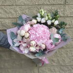 Ribbon - 1 pce Décoration - 4 pce pink peonies - 3 pce pink hydrangea - 1 pce white eustoma - 3 pce eucalyptus leaves - 4 pce bombastique spray pivoine rose - 3 pce fleurs de cymbidium - 2 pce