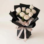 Le bouquet est une composition moderne et épurée de dix roses blanches immaculées, enveloppées dans un papier d'emballage noir dramatique qui lui confère une allure élégante à fort contraste. Les roses sont somptueuses et pleinement épanouies, leurs doux pétales ivoire contrastant vivement avec le papier noir mat qui se replie avec grâce autour des tiges. Un délicat ruban rose pâle est noué en un joli nœud à la base, ajoutant une touche subtile de féminité et de douceur à l'esthétique globale austère. Le papier noir et le ruban rose encadrent les roses blanches de manière élégante et sophistiquée, donnant à l'arrangement un air luxueux et chic.